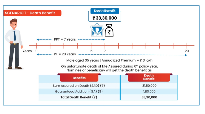a) Where the Risk (Life) cover has commenced, then the death benefit paid will be highest of Sum Assured on Death + Accrued Guaranteed Additions (GA) (if any) + GA for the year of Death (if applicable) OR Death Benefit factor x Guaranteed Maturity Benefit (GMB) and the policy will get terminated immediately